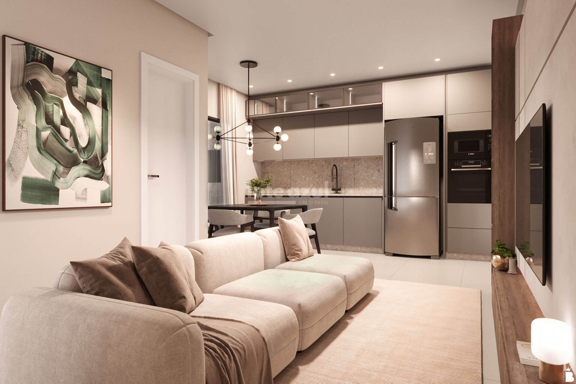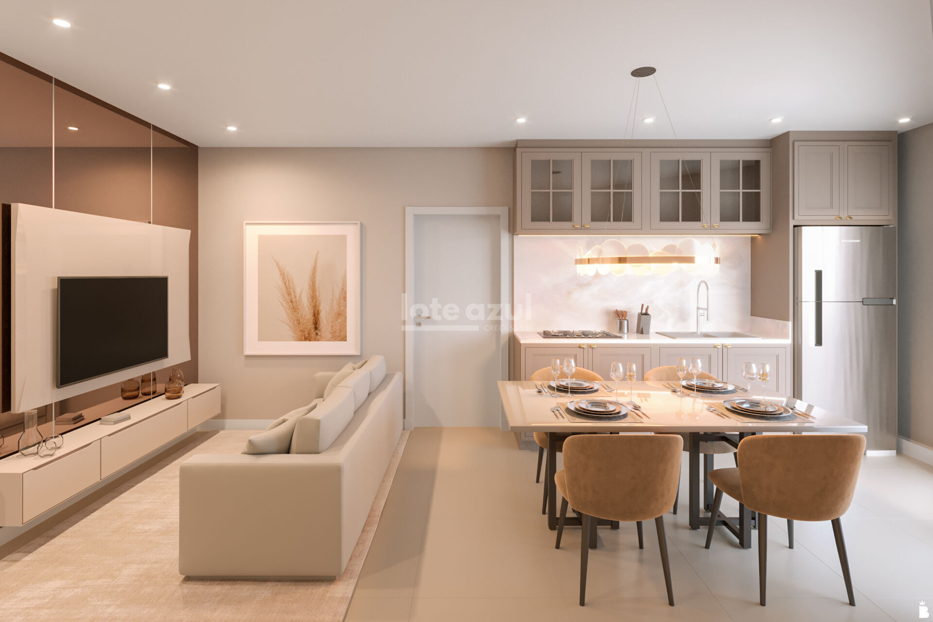 🔸 Living integrado e sacada com churrasqueira